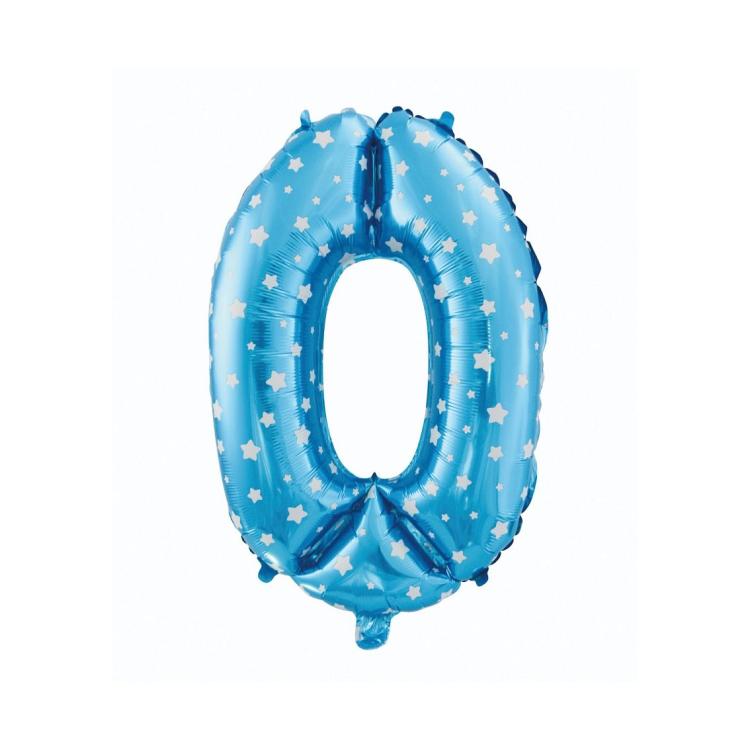 Idealny na urodzinki balon foliowy w kształcie cyfry 0. Można napompować go helem lub powietrzem. Balon ma piękny jasnoniebieski kolor i ozdobiony jest białymi gwiazdkami.