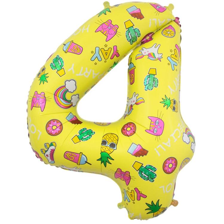 Idealny na urodzinki balon foliowy w kształcie cyfry 4. Można napompować go helem lub powietrzem. Balon ma piękny żółty kolor i ozdobiony jest kolorowymi obrazkami.