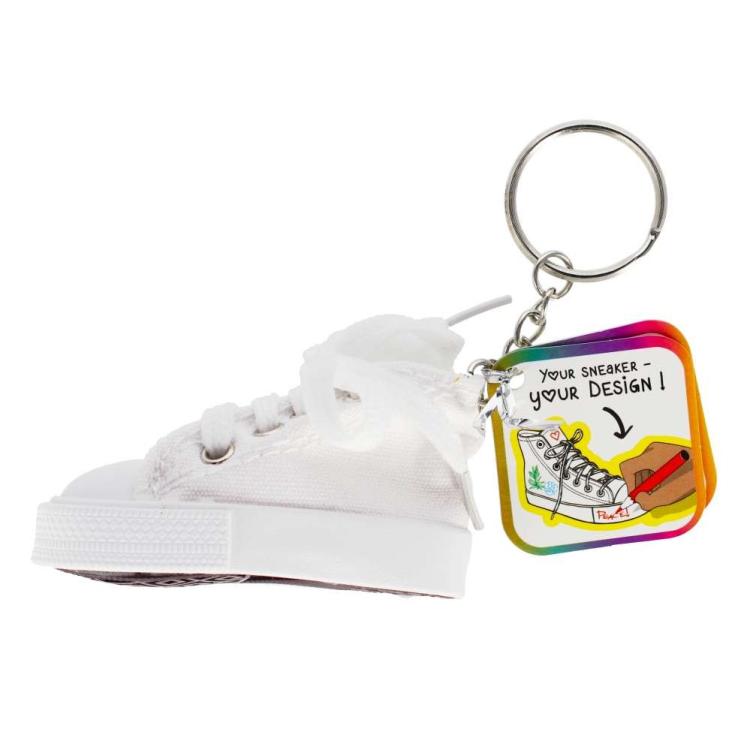 Nieduży brelok w kształcie buta. Wykonany jest jak prawdziwe obuwie. Ma gumową podeszwę, płócienną cholewkę i sznurówki, które można zapleść według własnego uznania. Brelok można pokolorować aby nadać mu unikalny wygląd.