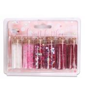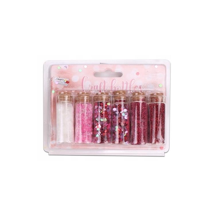 Są to małe szklane buteleczki wypełnione brokatem w różnych kształtach i kolorach. Brokat jest różnorodny — od klasycznego, drobnego brokatu, po większe, bardziej przestrzenne elementy, które tworzą interesujący efekt w projekcie.