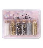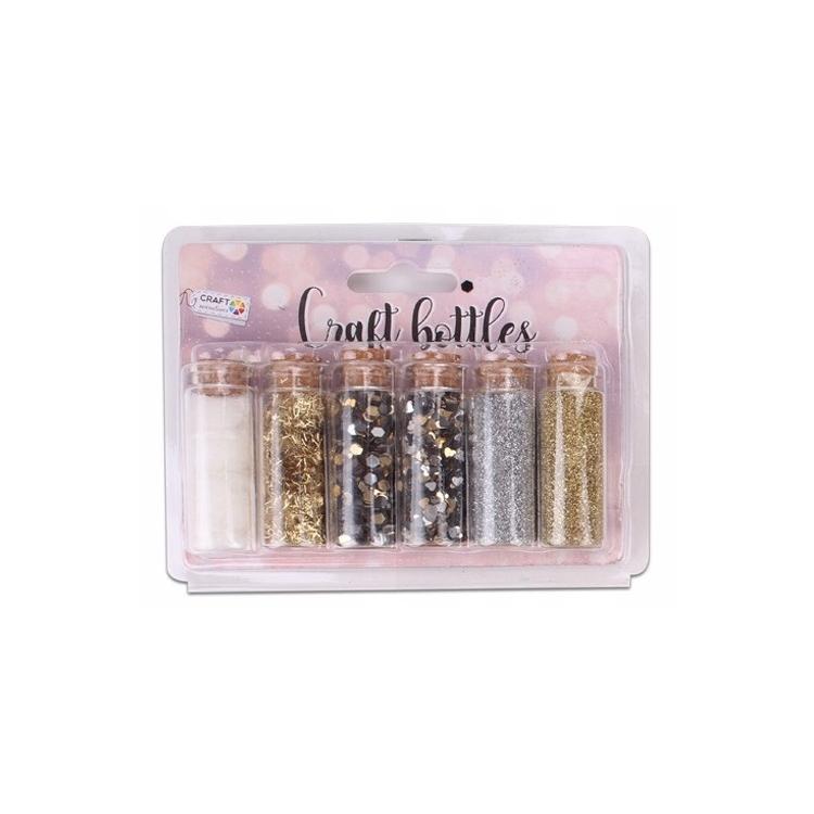 Są to małe szklane buteleczki wypełnione brokatem w różnych kształtach i kolorach. Brokat jest różnorodny — od klasycznego, drobnego brokatu, po większe, bardziej przestrzenne elementy, które tworzą interesujący efekt w projekcie.