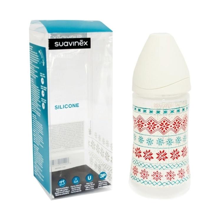 Wysokiej jakości poliamidowa butelka do karmienia niemowląt. Posiada okrągły, silikonowy, trójpozycyjny smoczek, który dostosowuje się do potrzeb dziecka i rodzaju pożywienia, ponieważ po obróceniu butelki pozwala regulować intensywność wypływu płynu, gwarantując prawidłowe ssanie od pierwszego dnia. Smoczek posiada również system antykolkowy, który zapobiegają gromadzeniu się powietrza i połykaniu go podczas karmienia.