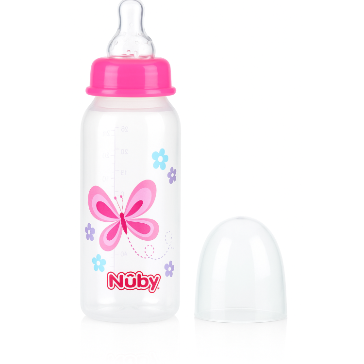 Nuby Dekor Butelka 240 ml 048526014866 łączy funkcjonalność z kolorowym, wesołym designem, który umila karmienie i przyciąga uwagę maluszka.