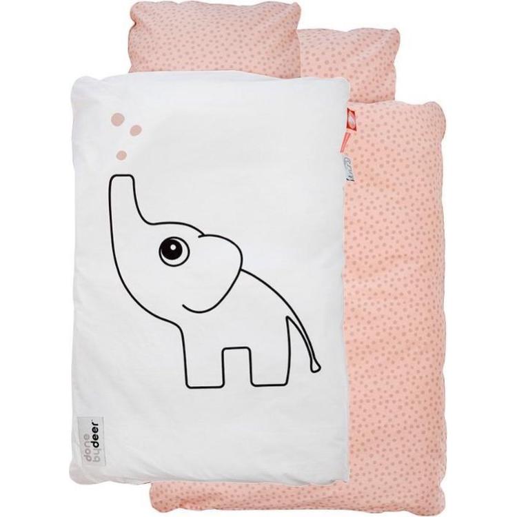 Uroczy komplet pościeli Done by Deer w kolorze powder z motywem słonika Elphee i ptaszka Birdee.