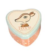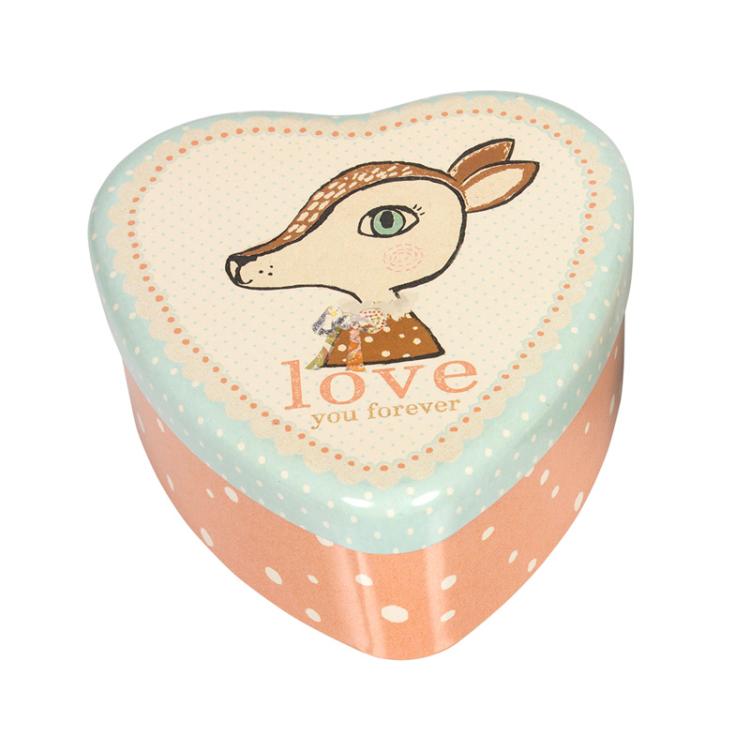 Kolorowe, metalowe pudełko w kształcie serca ozdobione rysunkiem uroczego jelonka.