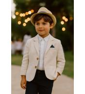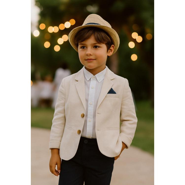 🌿 Tkanina premium – 77% bawełna, 21% len, 2% elastan – przewiewna i elastyczna 🪙 Zapięcie na dwa guziki – ponadczasowy detal dla młodego dżentelmena