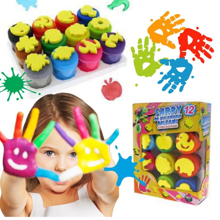 Gotowe do użycia farby do malowania palcami. Nie wymagają rozcieńczania z wodą. Zmywalne ze skóry i większości tkanin, nietoksyczne. Łatwo rozprowadzają się na różnych powierzchniach, pozostawiając żywe i trwałe kolory. Można je nanosić nie tylko palcami, ale również pędzlem lub gąbką.