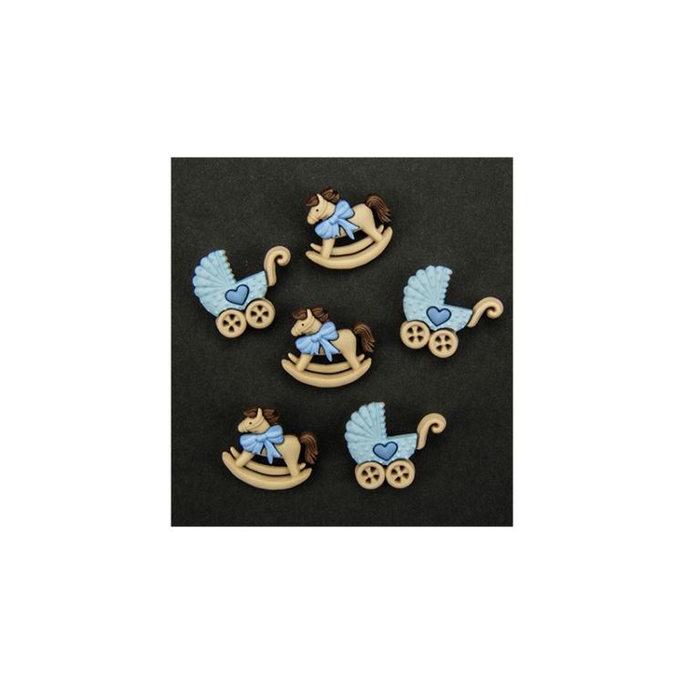 Guziki niebieskie wózeczek i konik na biegunach idealne do wykorzystania przy pracy nad prezentem na baby shower czy chrztu.