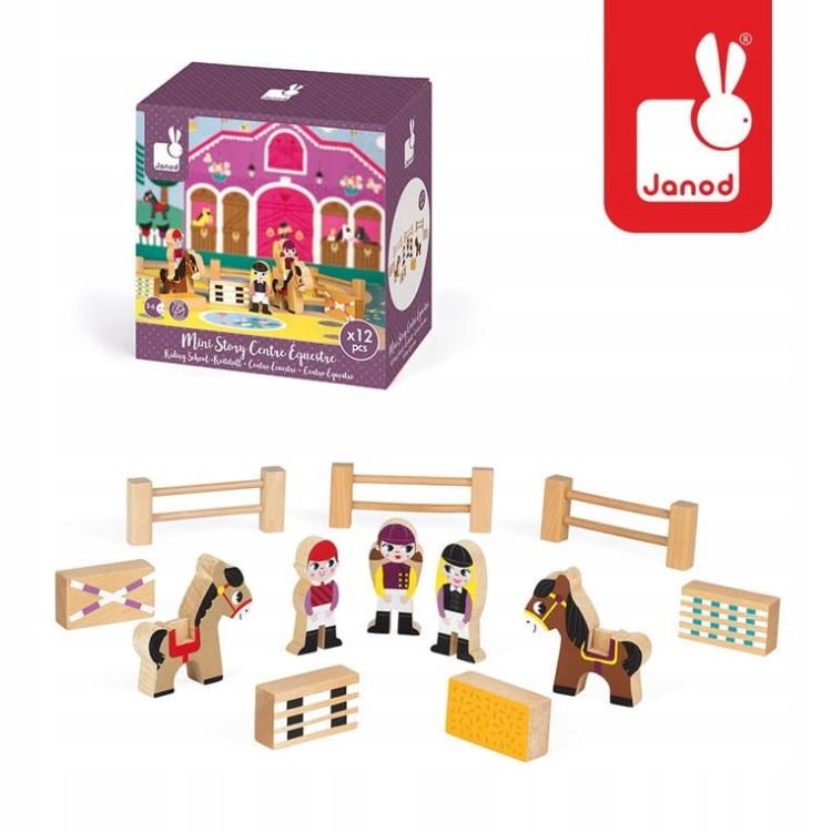 Zawiera 12 starannie zaprojektowanych elementów: chłopca i dwie dziewczynki w strojach jeździeckich, dwa konie, trzy barierki, trzy przeszkody oraz stóg siana. Figurki i akcesoria są wykonane z wysokiej jakości drewna, pomalowane bezpiecznymi farbami, przyjemne w dotyku i trwałe. Zestaw jest kompatybilny z innymi produktami z kolekcji STORY, co pozwala dziecku rozszerzać świat zabawy o nowe postacie, pojazdy czy budynki. Dzięki temu możliwości tworzenia historii są praktycznie nieograniczone.