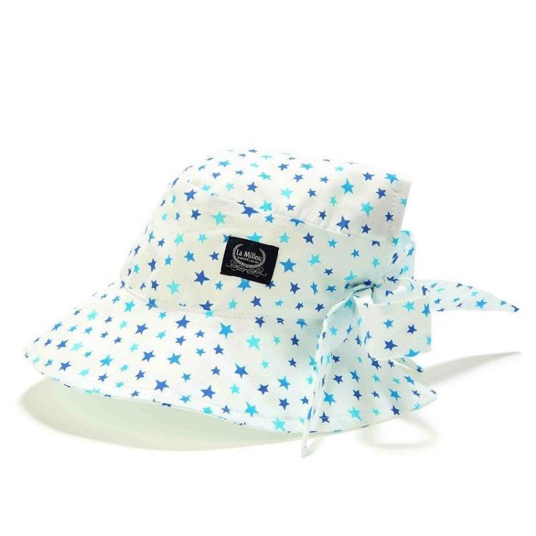 Kapelusik w jasnym kolorze na wiosnę/lato z niebieskimi gwiazdkami, duże rondo stanowi skuteczną ochronę przed słońcem!