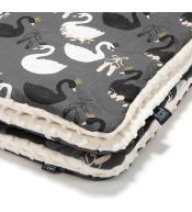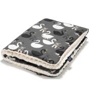 Mięciutki kocyk o większym rozmiarze. Świetnie sprawdzi się na spacerach i pasuje do każdego wózka. Może również pełnić rolę kołderki w łóżeczku. Kocyk jest dwustronny. Jedna strona wykonana jest z miękkiej wysokogatunkowej bawełny. Druga strona to mięciutki i miły w dotyku minky.