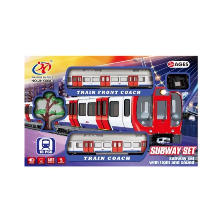 Zawartość: Zestaw zawiera 15 elementów, w tym 2 wagony, 12 elementów toru, jedno drzewo oraz elementy elektryczne z funkcjami dźwięku i światła.