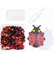Zestaw koralików do zaprasowywania z podstawką w kształcie biedronki. Opakowanie zawiera koraliki do zaprasowywania, z których można wykonać dwa motywy na dołączonej podkładce. Zestaw zawiera również pęsetę, papier do zaprasowywania oraz instrukcję.