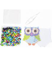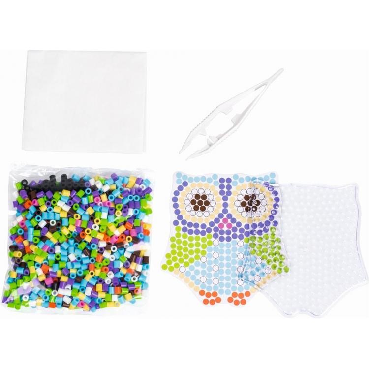Zestaw koralików do zaprasowywania z podstawką w kształcie sówki. Opakowanie zawiera koraliki do zaprasowywania, z których można wykonać dwa motywy na dołączonej podkładce. Zestaw zawiera również pęsetę, papier do zaprasowywania oraz instrukcję.