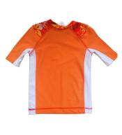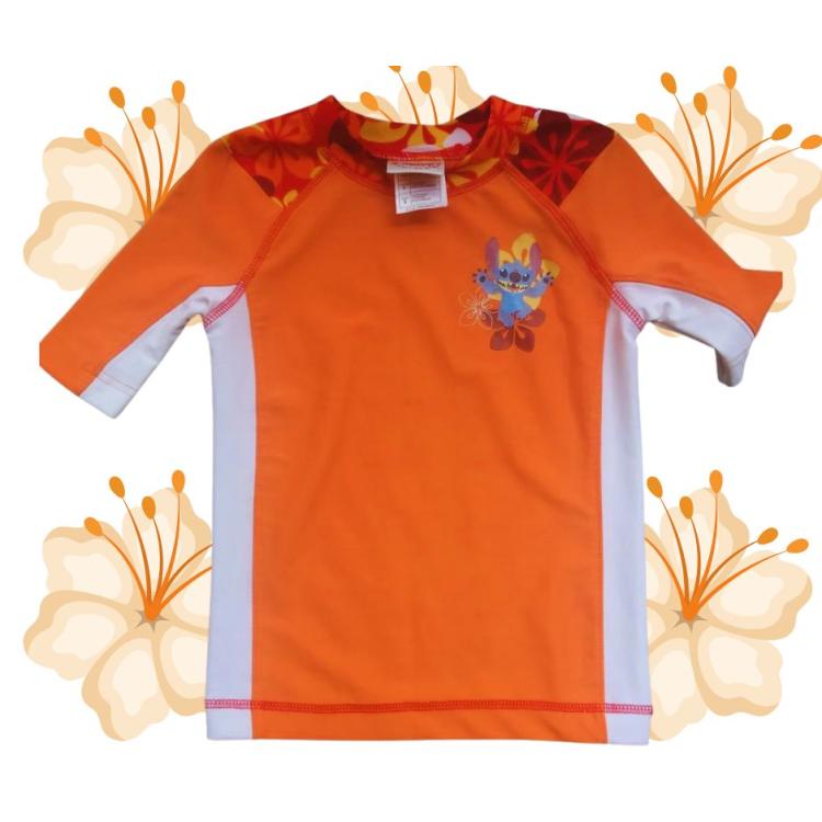 Lekka i elastyczna koszulka UV z krótkim rękawem w żywym pomarańczowo-białym kolorze, ozdobiona tropikalnym nadrukiem i postacią Stitcha – idealna na plażę i do zabawy w słońcu.