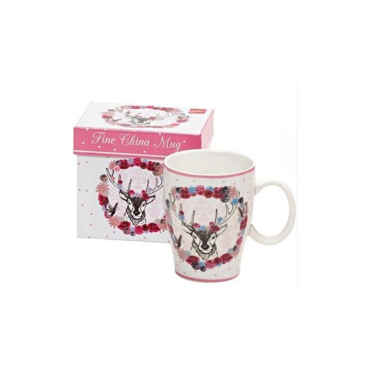 Starannie wykonany porcelanowy kubek z uroczą grafiką jelenia w otoczeniu kwiatów.