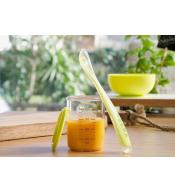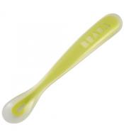 Ergonomiczna pierwsza łyżeczka dziecka francuskiej marki BEABA. Miękka końcówka wykonana została z ultra elastycznego silikonu, w pełni bezpiecznego dla delikatnych dziąseł maluszka. Jej kształt został zaprojektowany tak, by ułatwiał malcowi przejście ze smoczka na łyżkę. Długość uchwytu sprawia, że łyżeczka nadaje się również do jedzenia pokarmów ze słoiczka. Uchwyt ten jest ponadto zaprojektowany do trzymania przez dorosłe ręce, podczas karmienia dziecka. Łyżeczka w neonowej zieleni z transparentnymi brzegami.Łyżka łatwo się czyści, można ją myć ręcznie lub w zmywarce.