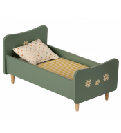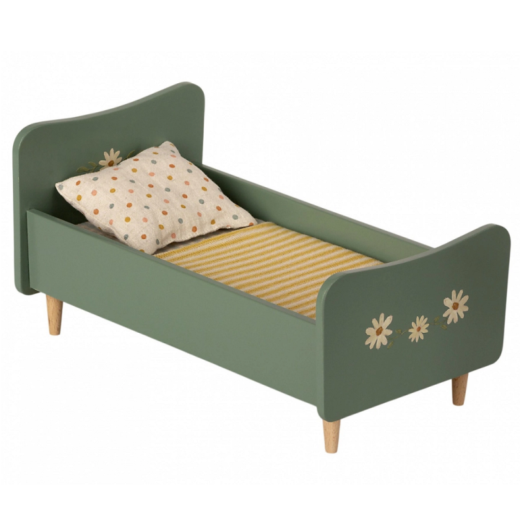 Urocze, drewniane łóżeczko Maileg w rozmiarze Midi, idealne dla myszek, zajączków i króliczków tej marki. Ozdobione ręcznie malowanymi, delikatnymi kwiatkami, które nadają mu wyjątkowego uroku.