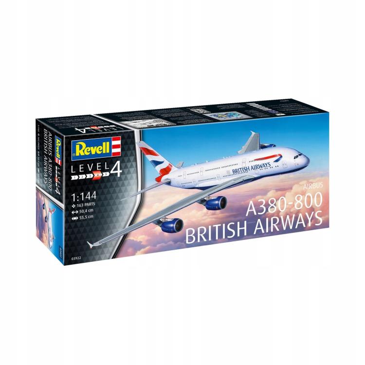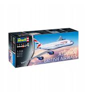 Model samolotu Revell A380-800 British Airways. Szczegółowe odwzorowanie, kalkomanie, dwupokładowy kadłub i cztery silniki. Idealny dla fanów lotnictwa.