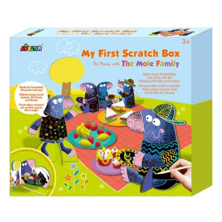 Jeśli idziesz na piknik, jaki rodzaj jedzenia i picia byś przygotował? Chcesz wiedzieć, co rodzina Kretów zabrała na piknik? Przyjdź i znajdź odpowiedź w Avenir My First Scratch Box. Zdrap czarną powierzchnię na stronach zeszytu, aby odkryć, co przygotowała rodzina Kretów! Zabawa z jedzeniem gwarantowana! Stwórz kolorowe bączki dzięki elementom wydrapywanek oraz pyszne jedzenie dzięki dołączonej do zestawu modelinie w czterech kolorach.