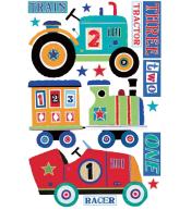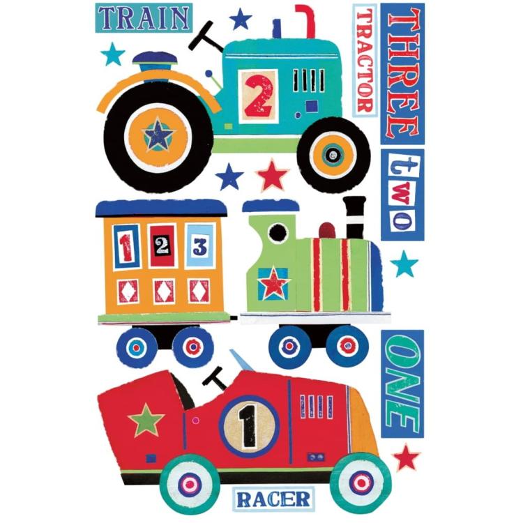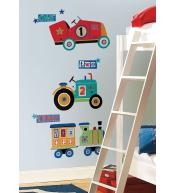 Zestaw 16 dużych naklejek wielokrotnego użytku, które można przyklejać na każdą czystą, suchą i gładką powierzchnię (ściany, meble, okna, ceramikę itp.). 3 największe naklejki pojazdów mają wymiary: 57,7x33, 53,9x37,4 oraz 57,15x34,2 cm.