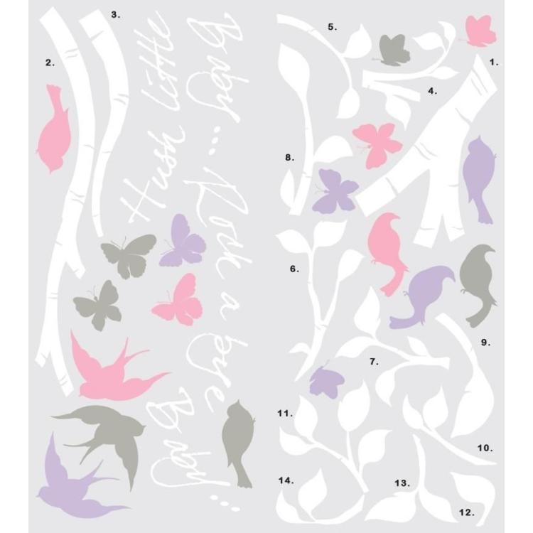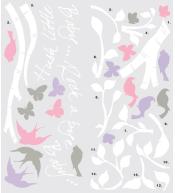 Zestaw 38 dużych naklejek wielokrotnego użytku, które można przyklejać na każdą czystą, suchą i gładką powierzchnię (ściany, meble, okna, ceramikę itp.). Z naklejek można ułożyć kompozycje o wymiarach: 131,6 x 84,6 cm.