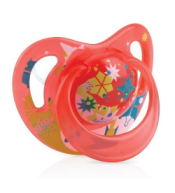 Smoczek Nuby o ortodontycznym kształcie z masującymi guzkami i otworami wentylacyjnymi. Łagodzi dziąsła, wspiera ząbkowanie i jest w 100% wolny od BPA.