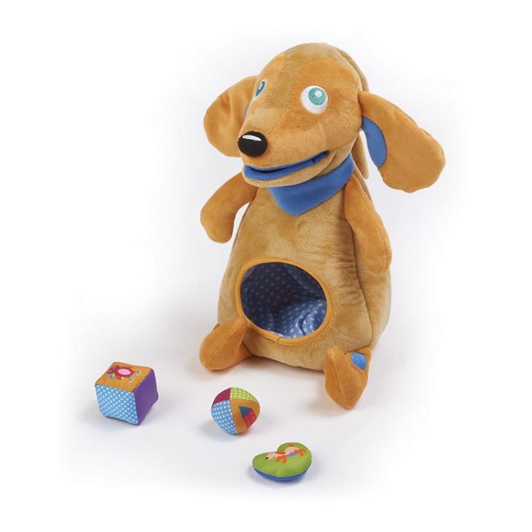 Ten pluszowy piesek jest ciągle głodny... a żywi się miękkimi, kolorowymi kawałkami tkaniny! Dziecko umieszcza je w ustach pluszaka i stara się znaleźć „jedzenie” w małym brzuchu przyjaciela. Jest to gra stymulująca i edukacyjna, która zachęca dziecko do odkrywania i korzystania z umiejętności logicznych. Zabawka jest wyposażona w haczyk, dzięki czemu można ją zawiesić w dowolnym miejscu.