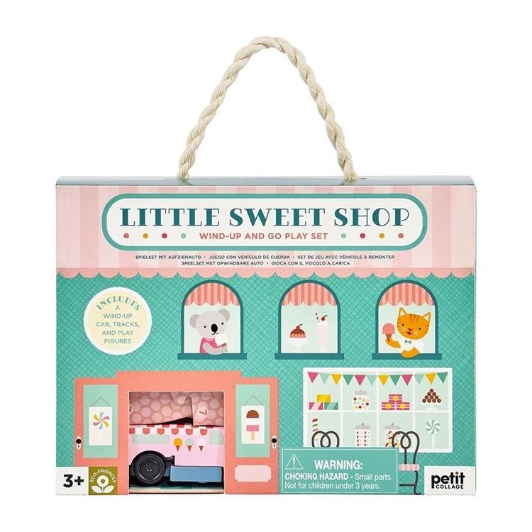 Zestaw zawiera: - dwustronny sklep ze słodyczami, - drewnianą, nakręcaną ciężarówkę z lodami, - 8 elementowy tor do jazdy, - 10 elementów rozkładanych i zabawkowych,