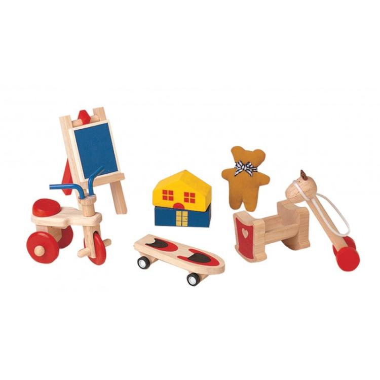 Zestaw drewnianych zabawek dla lalkowych dzieci. Jest tutaj mini trójkołowy rowerek, tablica, deskorolka, miś, domek, konik na patyku i kołyska. Zestaw pasuje do domków, lalek oraz mebelków z serii PlanDollhouse. Wykonany z niezwykłą precyzją drewniany zestaw zachwyci dzieci i dorosłych! Komplet pozwala na zaaranżowanie przestrzeni w domku tak, jak dziecko uważa, dzięki czemu uczy się zachowań społecznych, ćwiczy wyobraźnię oraz małą motorykę.