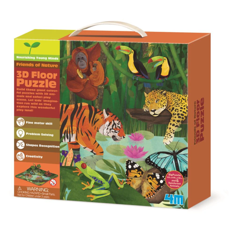Przestrzenna układanka, która gwarantuje doskonałą zabawę na kilku płaszczyznach jednocześnie. Płaskie puzzle przedstawiają scenerię z lasu deszczowego, a dołączone do nich trójwymiarowe szablony - zwierzęta. Po ułożeniu całej układanki trójwymiarowe zwierzęta mogą posłużyć dzieciom do dalszych zabaw. Pozwól zaszaleć dziecięcej wyobraźni podczas odkrywania tej wspaniałej krainy zabawy.