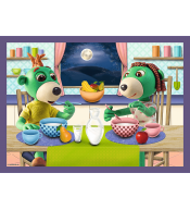 Zestaw puzzli umożliwiający ułożenie czterech niezwykle kolorowych obrazków przedstawiających zabawną rodzinę Treflików i ich wieczorne zajęcia.