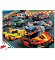 Kolorowa układanka przedstawiająca dynamiczną scenę wyścigów samochodowych, zaprojektowana z myślą o dzieciach powyżej 6. roku życia. Zestaw składa się z 72 dużych elementów wykonanych z grubego, wytrzymałego karton z recyklingu. Obrazek nadrukowany tuszami sojowymi.