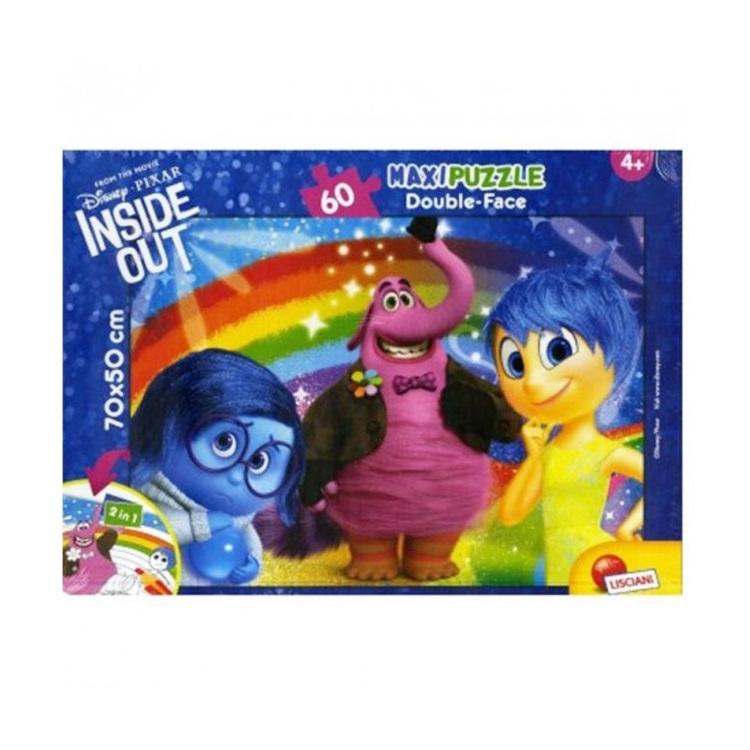 Zestaw dużych dwustronnych puzzli z postaciami z filmu animowanego W głowie się nie mieści. Z jednej strony znajduje się gotowy do ułożenia obrazek a z drugiej obrazek do pokolorowania.