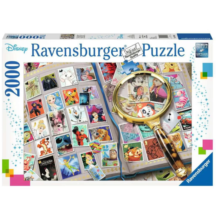 Puzzle z plejadą gwiazd Disneya w formie znaczków.