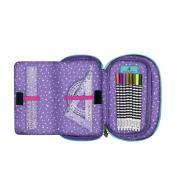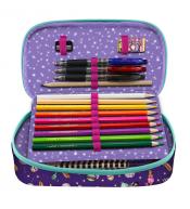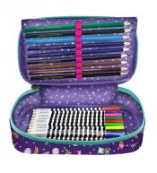 Piękny piórnik z bogatym wyposażeniem będzie Ci towarzyszył przez wiele lat. Zawiera ołówek HB, komplet 3 długopisów kulkowych w trzech kolorach, gumkę i temperówkę. Na specjalnej usztywnionej wkładce umieszczono bogaty komplet 18 kredek. Po otwarciu rzepów znajdziemy linijkę, ekierkę i kątomierz. Na dnie komplet 18 flamastrów. Każdy element wyposażenia posiada logo Santoro. Wykonany ze szczególną dbałością. Wewnątrz posiada ciekawy wzór. Wspaniały na prezent.
