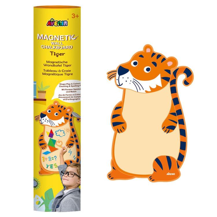 Magnetyczna tablica wieszana na ścianie jest niezbędnym wyposażeniem pokoju malucha! Tablicę można łatwo zamocować na ścianie albo każdej gładkiej powierzchni. Dołączone do zestawu cyferki i literki pozwolą dziecku na naukę czytania, a magnetyczne trójkąty na zabawę w tangram. Specjalne magnesy w kształcie przedmiotów znanych dziecku z codziennego życia pozwoli na ułożenie planu dnia lub zabawy w dopasowywanie przedmiotów i czynności do pory dnia. Po tablicy można również pisać i rysować kredą. Urocza tablica magnetyczna w kształcie tygryska ma wymiary około 58 x 36 cm.
