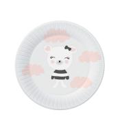 Zestaw klasycznych okrągłych papierowych talerzyków. Uwagę przykuwa nadruk ze słodkim biało czarnym misiem z kokardką na tle różowych chmurek.