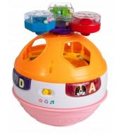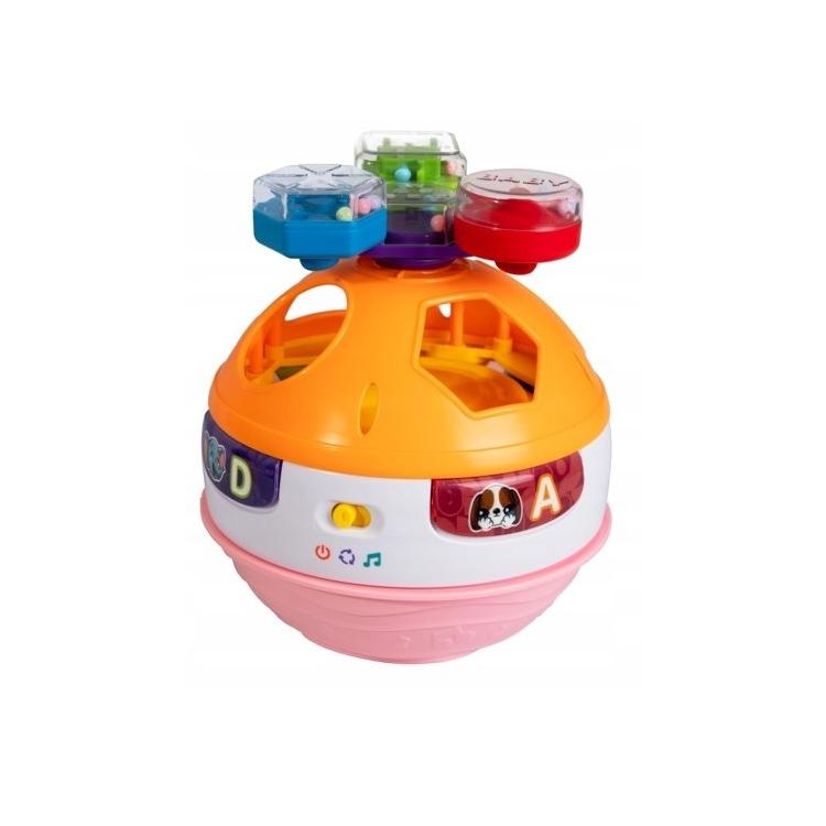 Wbudowane przyciski z nazwami liter oraz zwierząt w języku angielskim wspomagają naukę podstawowych słów, rozwijając zdolności językowe i słuchowe malucha. Dodatkową atrakcją jest możliwość włączenia ruchu obrotowego, co dodaje dynamiki i zachęca dziecko do aktywnej zabawy.