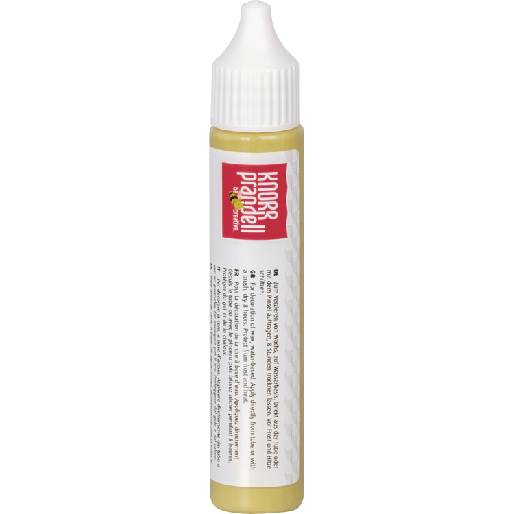 Kredka woskowa służąca do dekoracji świec. Wygodny aplikator pozwala na dokładne aplikowanie płynnego wosku. Plastikowa tuba zawiera 29 ml wosku w kolorze złotym.