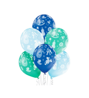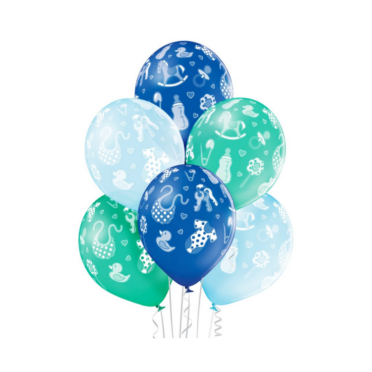 6 balonów z nadrukiem zabaweczek. Z helem lub bez. Na imprezę Baby Shower dla chłopca.