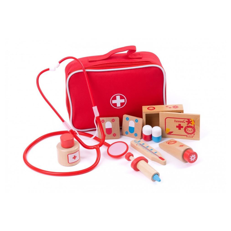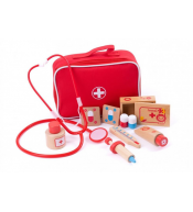W środku znajduje się wszystko co niezbędne dla miłośnika leczenia ludzi bądź zwierząt. Połączenie czerwonego i białego doskonale oddaje charakter prawdziwych przyborów lekarskich, dzięki czemu spodoba się każdemu maluchowi, odkrywającemu świat. Zestaw lekarza zawiera wszystkie niezbędne akcesoria, które zapakowane są w zamykaną na zamek, niezwykle wytrzymałą czerwoną torbę. Rozwój poprzez zabawę Ten drewniany zestaw pomoże Twojemu dziecku rozwinąć niezwykle ważne umiejętności społeczne.